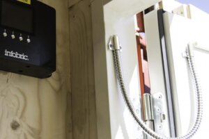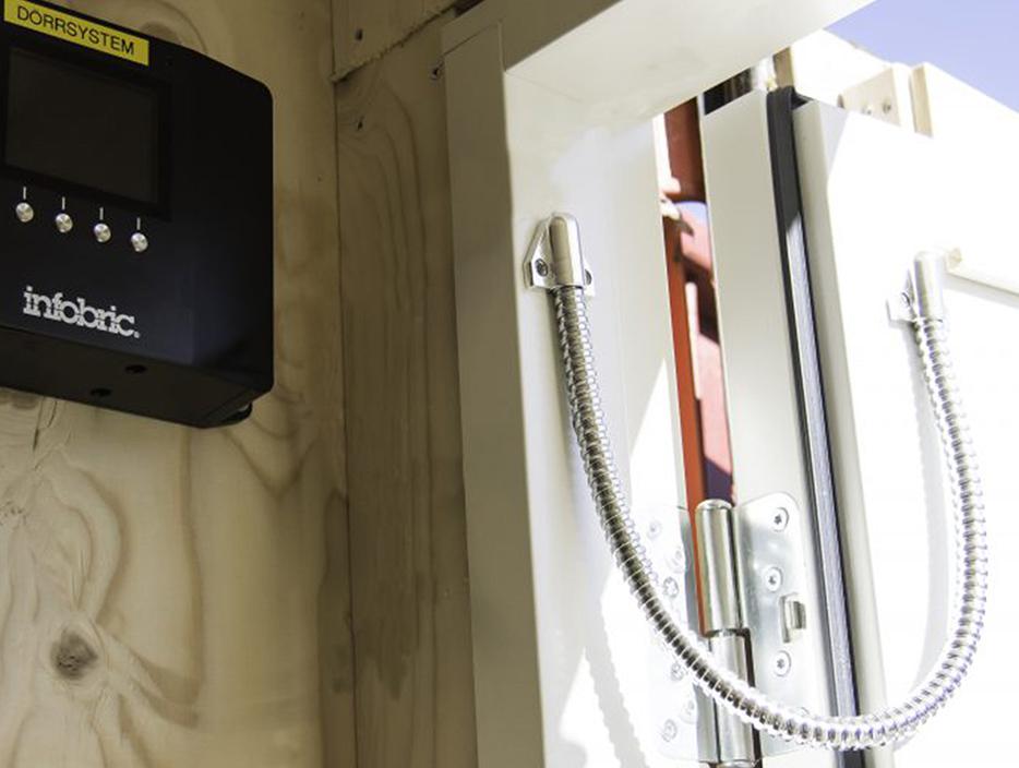 Infobric elektronisk dørlås åpnes med lovpålagt HMS-kort av personer som er tildelt adgang. Slik holdes uvedkommende unna brakker og containere, og man får bukt med svinnet. HMS-kort som nøkkel er et sikrere valg, og man unngår nøkler og koder som ofte kommer på avveie. Systemet fungerer på alle standardlåser og er lett å flytte rundt. Istedet for å ta ned dørsystemet og sette det opp på neste prosjekt bruker du en komplett dør med montert dørlås. Dørsystemet er integrert med Infobric sin webtjeneste Ease, som følger med mot en abonnementsavgift. I Ease styres hvem som har adgang til hvilke tider og hvor, og det rapporterer i sanntid oversiktlig hvem som har vært innom brakke og utstyrscontainere. Ease er det samme systemet som benyttes ved bruk av Infobrics byggekortlesere på rotasjonsgrind, kjøreport etc.