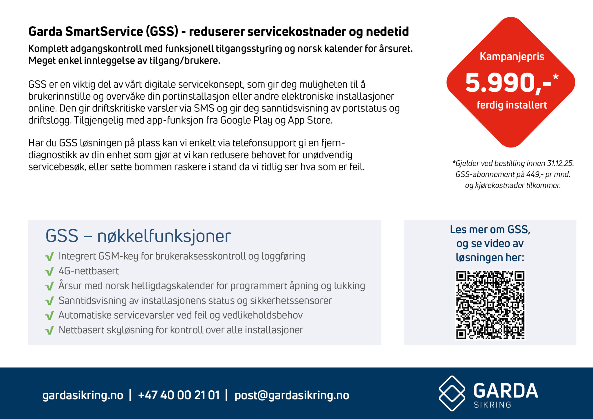 Kjørekostnader og månedlig GSS-abonnement på 449,- tilkommer. Alle priser eks. mva.
