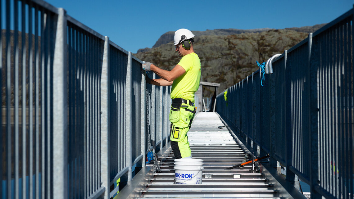 I Saudefaldene har vi nylig avsluttet et unikt prosjekt der vi leverte 167 meter gangbaner i aluminium og 390 meter rekkverk i galvanisert stål. Arbeidet krevde presis planlegging, nøye koordinering og tett samarbeid med både kunden, stålprodusenten og helikopterfirmaet. Montasjen startet ved nedre Holmavatn, og modulene ble fløyet opp til demningen på 700 meters høyde – en operasjon som krevde nøyaktig vurdering av vekt og flyveavstand for å få alt på plass. På dette prosjektet leverte vi også gangport og trapper i aluminium, alt tilpasset forholdene og oppgaven.