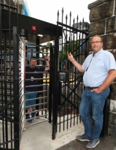 På bildet under står prosjektleder i Garda Sikring, Petter Strømme, ved rotasjonsgrinden som har blitt fint integrert i det eksisterende og verneverdige smijernsgjerdet.