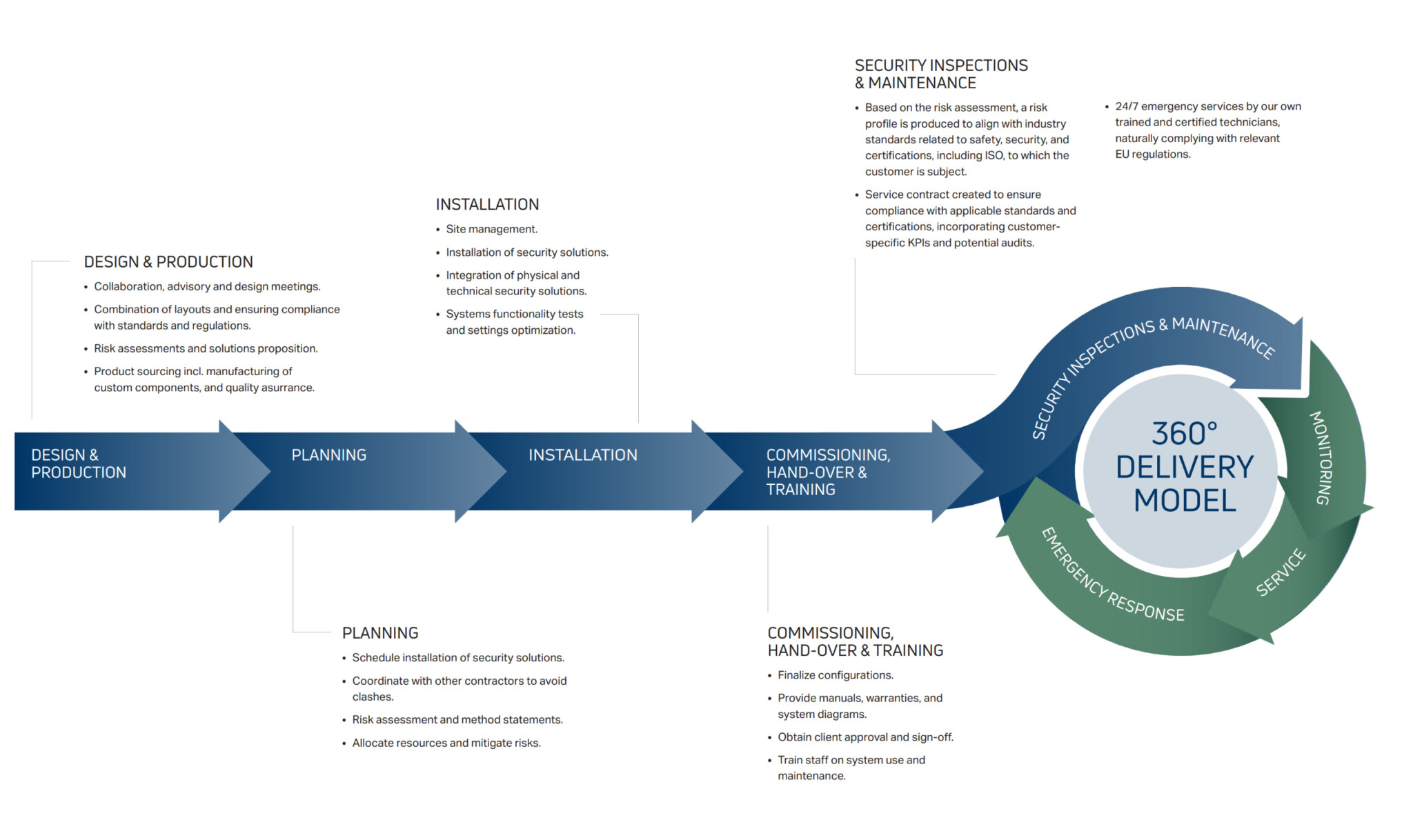 Med en trinnvis og skreddersydd tilnærming sørger vi for 360° sikkerhet, døgnet rundt, hele året.