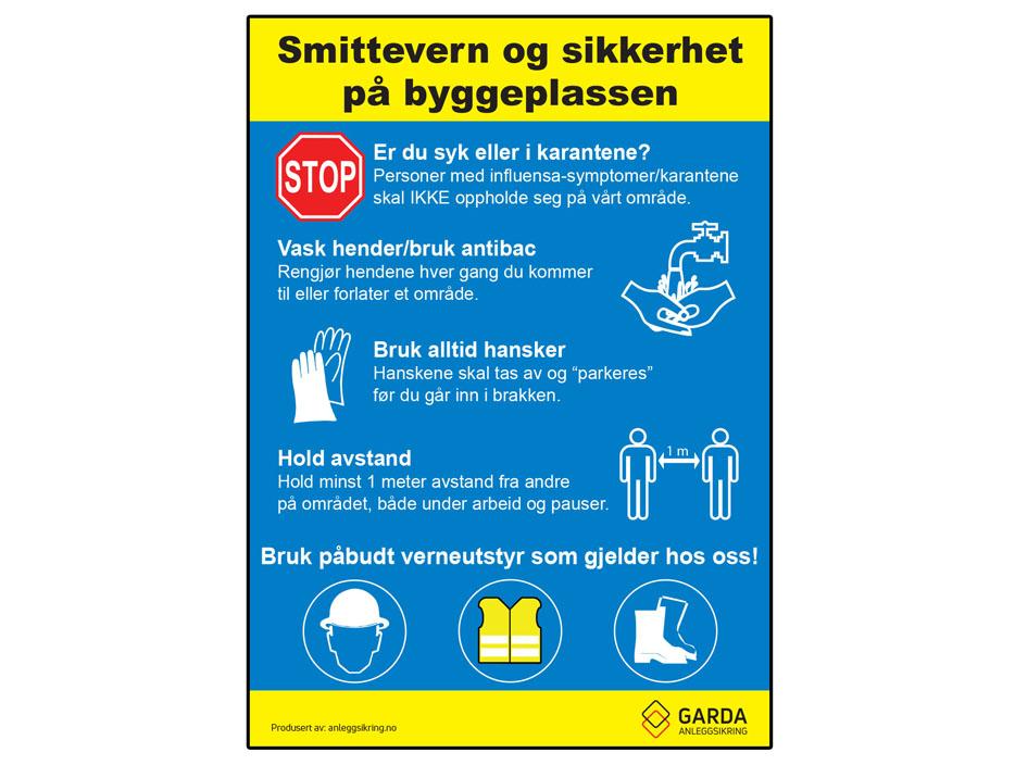 Byggeplasskilt i aluminium med varsling om smittevernregler og bruk av verneutstyr.