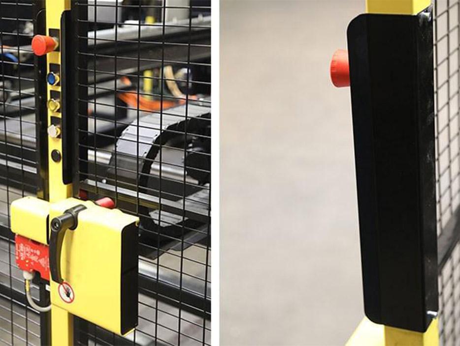 2. Legg til sikkerhetstiltak: Lås faren inne (eller personer ute), f.eks. ved hjelp av gjerde. Overvåk kontakt med mennesker og fare, og stopp faren i tide, f.eks. med sikkerhetsbrytere, lysbarrierer, laserskannere mm. Gi operatøren kontroll over faren, f.. eks. med en aktiveringsknapp eller tohåndskontroll.