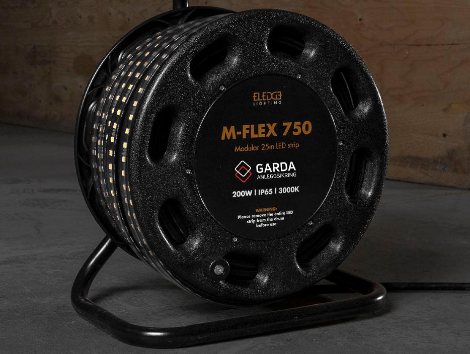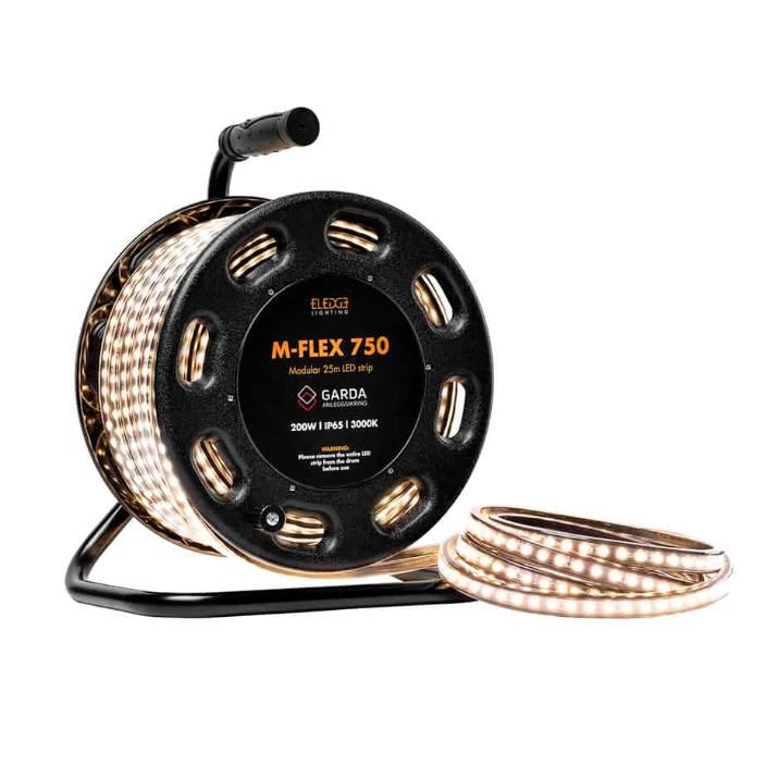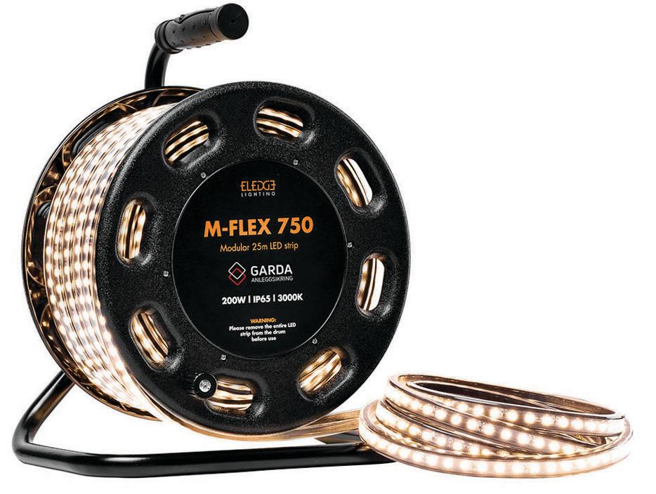 Nyhet! Nemko-godkjent trommel. Forsikrer at produktet er trygt og holder god kvalitet. Belysning både utendørs og inne i bygg er enkelt og rimelig ved bruk av 25 m LED-lys på trommel. Gir et kraftig lys, og vår Nemko-godkjente M-Flex versjon kan seriekobles opptil 150 m. Kan ofte erstatte tradisjonelle lyskilder. Robust utførelse, og man unngår pærer som knuses eller må skiftes ut. Hver rull består av høy-ytelses lysdioder som er fordelt jevnt over hele lengden. Dette gir et godt arbeidslys langs hele LED-stripen. LED-strip har mange bruksområder og er delt opp i uavhengige segmenter på 1 m, som betyr at dersom et segment slutter å virke vil resten av LED stripen fortsette å lyse. Man sparer både tid, penger og miljø ved å bruke slik type lys. Den er svært raskt å montere (normalt benyttes kun strips), tar liten lagringsplass og LED-stripen er robust og har ingen knuselige deler eller pærer som må skiftes. Det betyr lave drifts- og vedlikeholdskostnader.