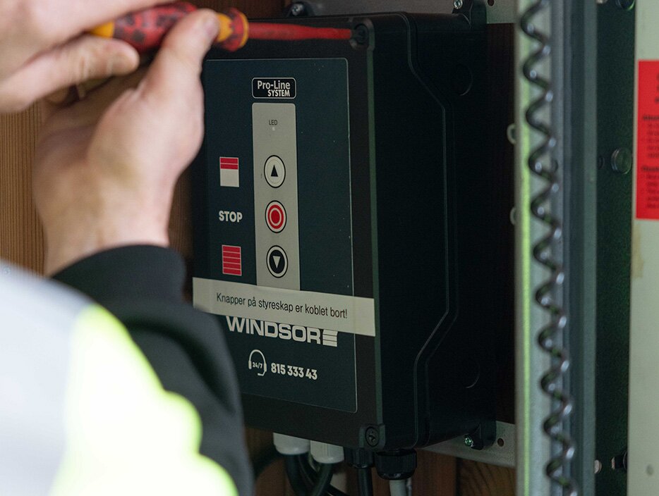 Vi tilbyr nødstopp installert i styreskapet dersom kunde, bransjeorganisasjoner eller myndigheter fastsetter at den elektrisk betjente leddheiseporten må ha denne sikkerhetsmekanismen.