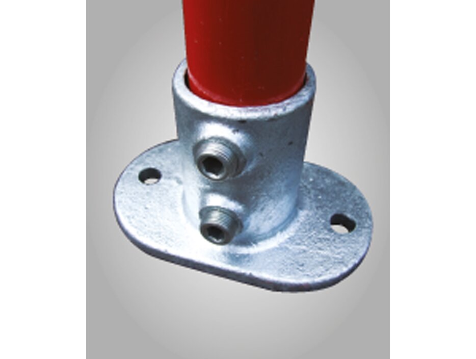 En fotplate for innfesting av vertikale stolper. Når denne brukes som feste av rekkverk, bør den alltid plasseres med hullene på tvers av rekkverkets linje for å gi maksimal styrke. Hullene i bunnplaten er store nok til å muliggjøre bruk av mekanisk eller kjemiske forankring.