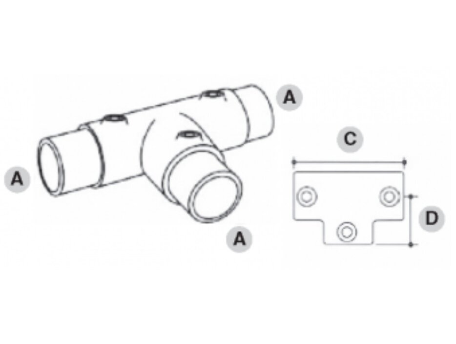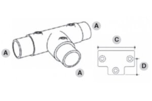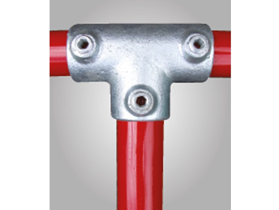 Dette er en 90° T-kobling for å forbinde to rør. Typisk bruk er på rett og plant rekkverk for å koble vertikalen til topprøret. Denne koblingen kan brukes til å skjøte sammen rør i toppen.