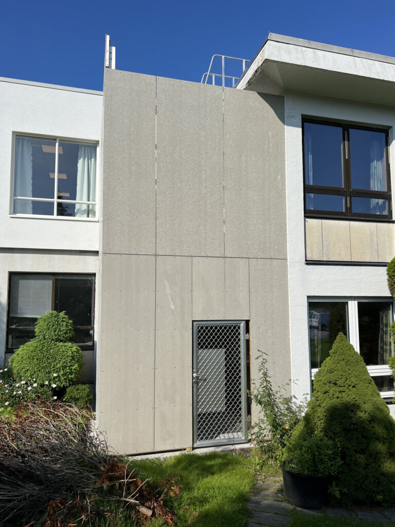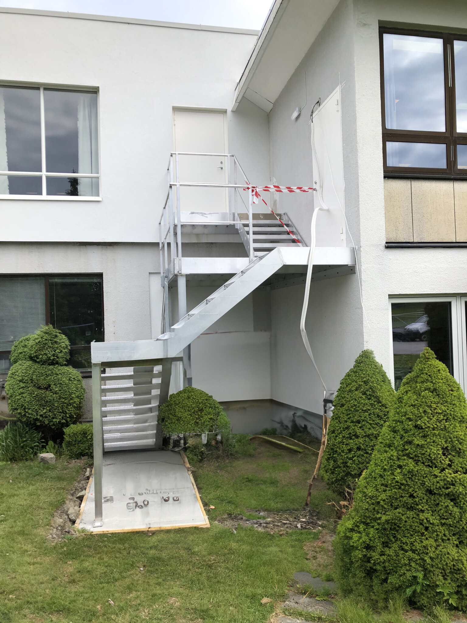 Vi leverte aluminiumsløsninger til Karmøy Folkehøgskole gjennom vår kunde Saga Bygg AS. Leveransen besto av rømningsdør, 1 stk større rettløpstrapp for rømming med repos og rekkverk, samt en inspeksjonsleider til tak fra denne rettløpstrappa. Rettløpstrappa for rømning ble på grunn av brannkrav kledd inn. Bildet under viser før og etter at veggen ble satt opp.