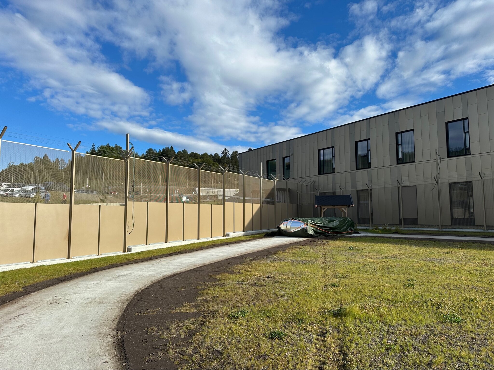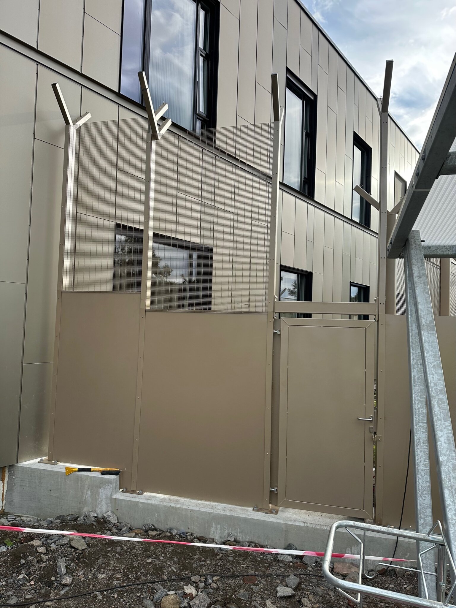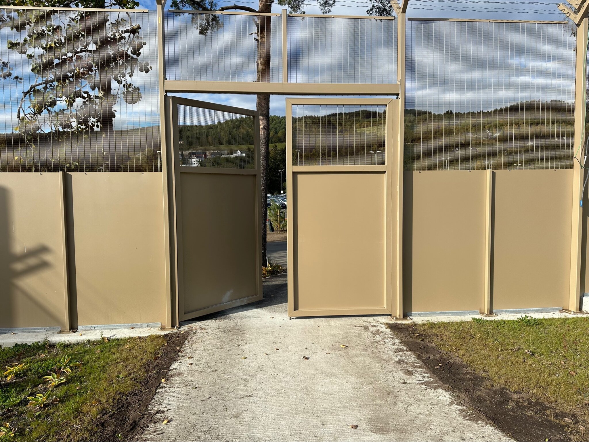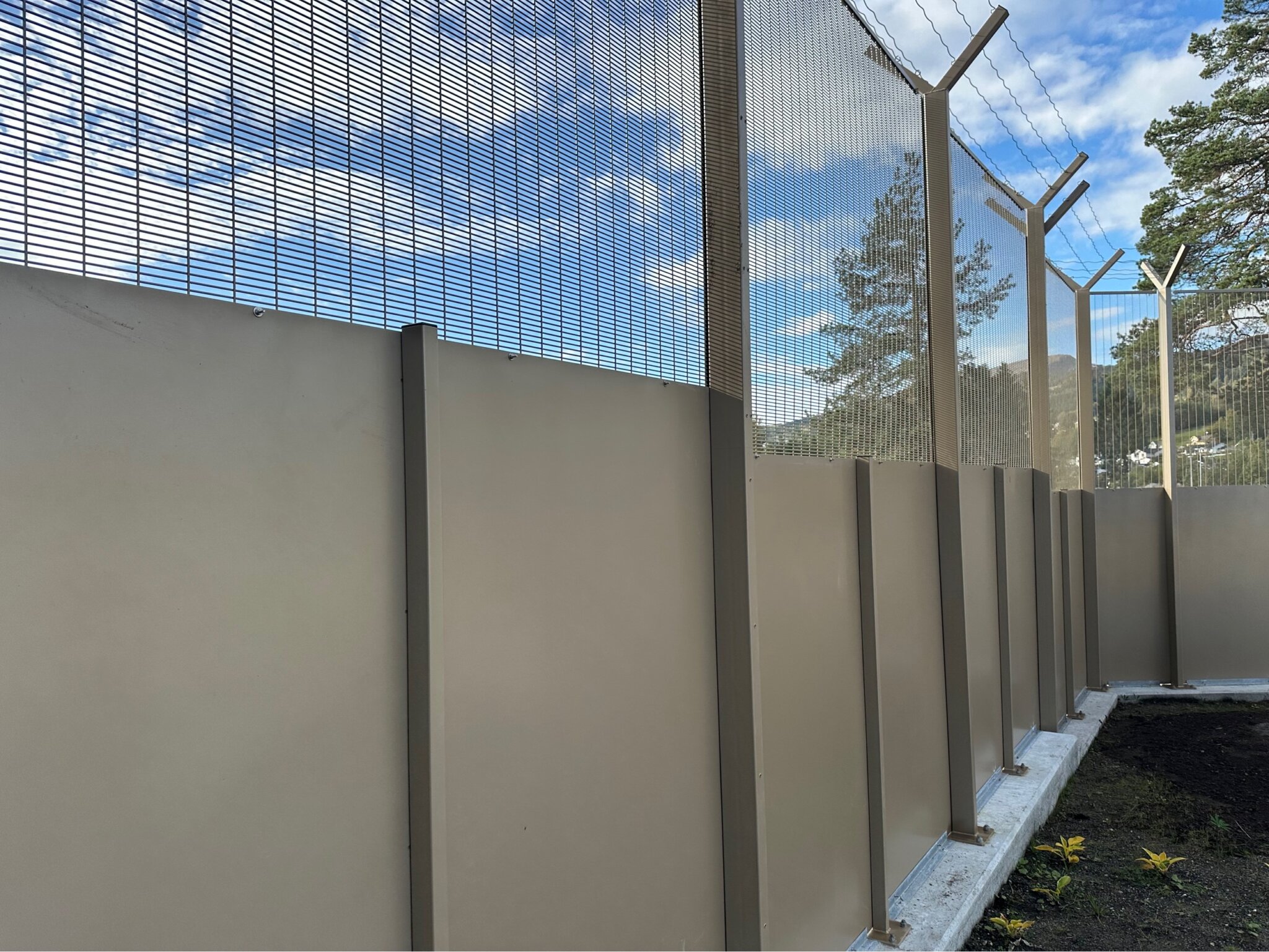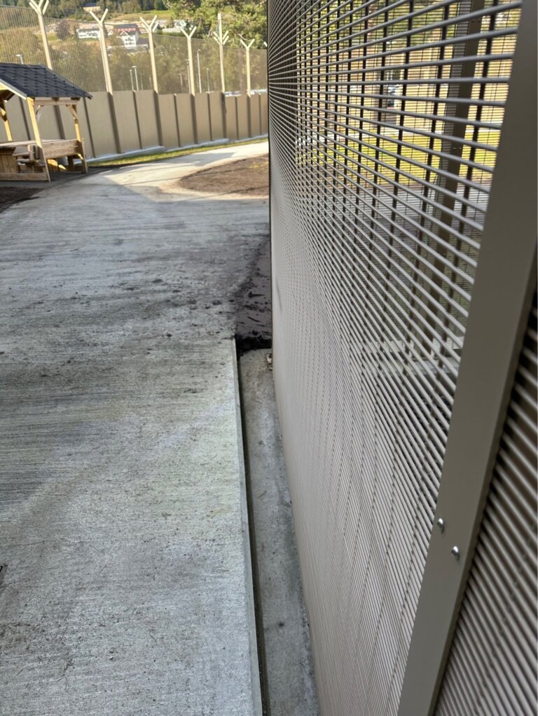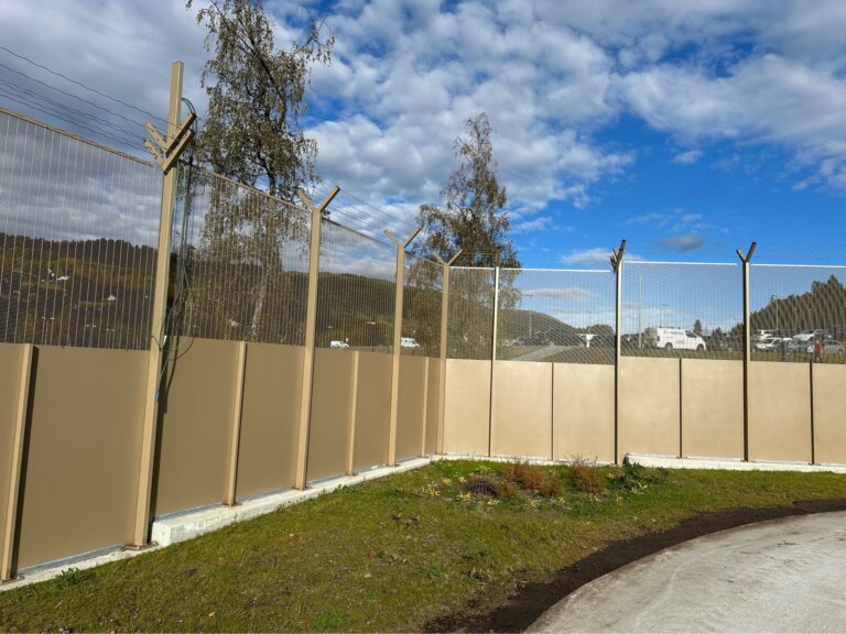 Når det er behov for ekstra sikkerhet, har vi til et prosjekt levert Securifor med solide stålplater som bunnfylling og piggtråd på toppen. Høyder på 3 og 4 meter, og pulverlakkert i RAL 1035.