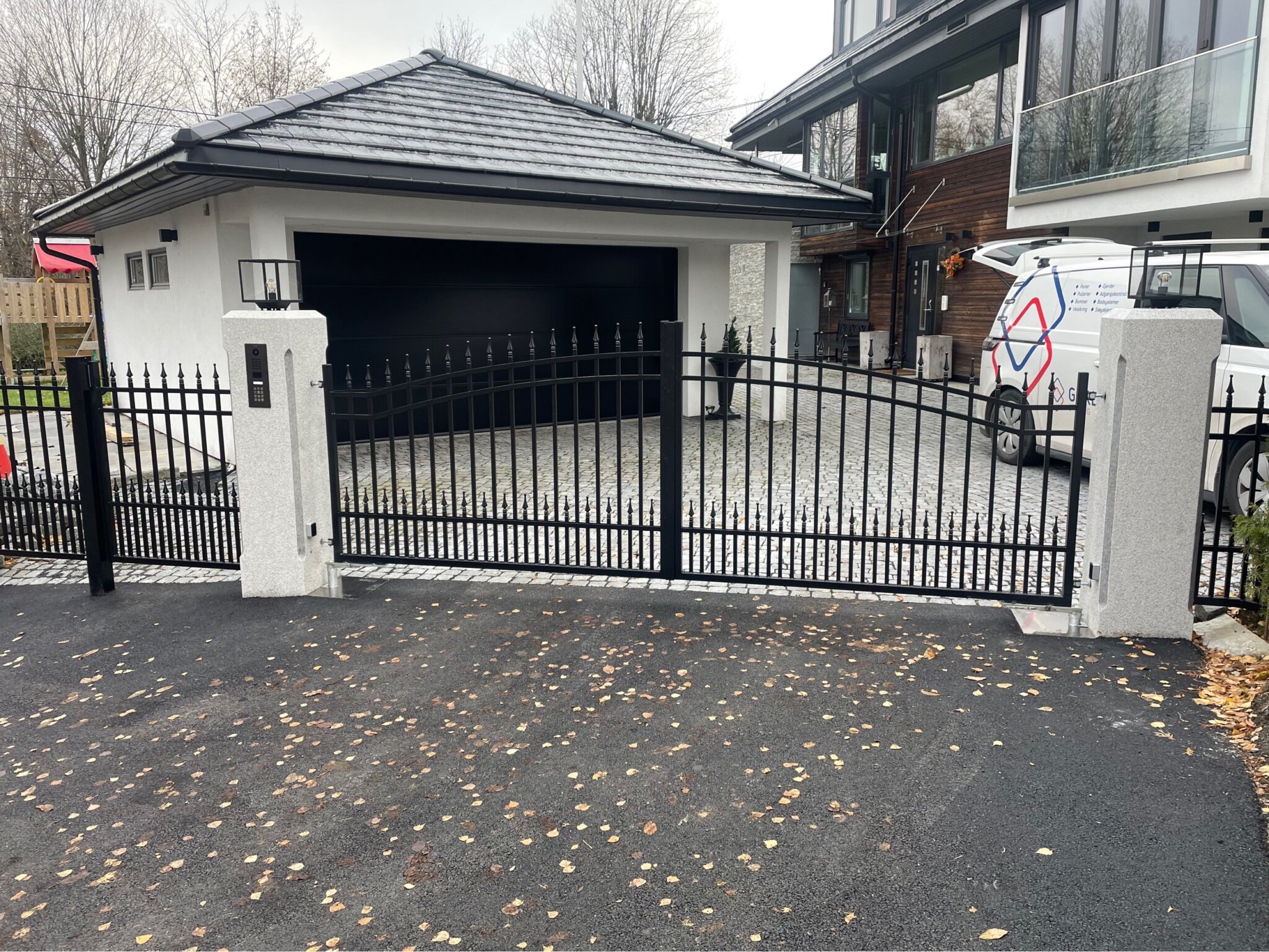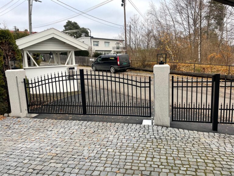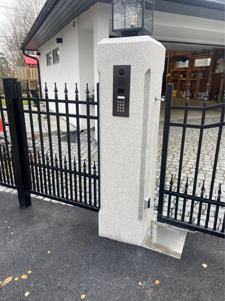 Vi har montert en flott kjøreport og gangport for kunde i Oslo. Gangporten har magnetlås og i granittstolpe er det kodepanel for styring av porten.