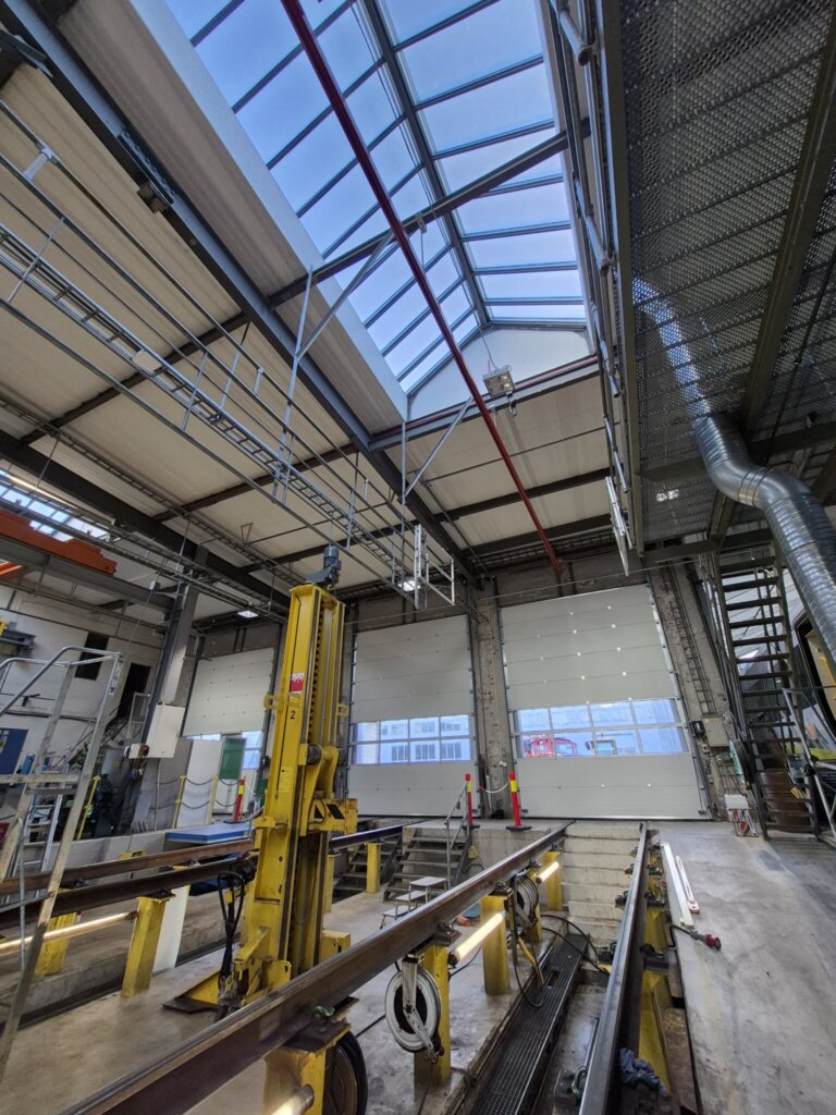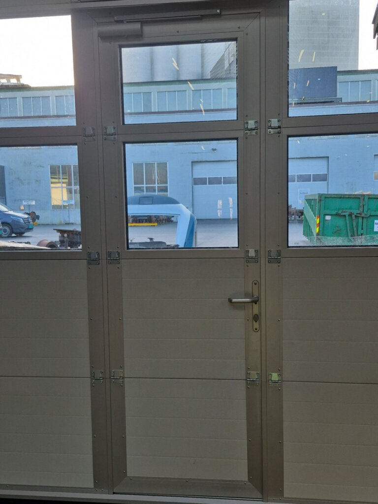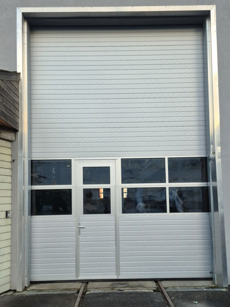 I prosjektet har vi levert totalt fem leddheiseporter – to porter med integrert gangdør og tre porter uten dør. Samtlige porter er levert med to rader vindusfelt, noe som gir godt lysinnslipp i verkstedhallen. Utvendig farge RAL 9006 Silver og innvendig RAL 9002.