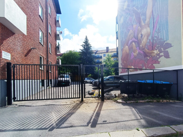 Det var behov for utskiftning av borettslagets eksisterende sikring av området, og vi ble valgt til å levere og montere en komplett løsning med porter og gjerde. Sikringen består av 1-fløyet slagport med firkantprofil og sprossefylt (spiler). Høyde 2m og bredde 3,5m, montert på nedstøpte stolper i sort. Gangport o firkantprofil og med flettverksfylling. Gjerdet er et Garda S2 flettverksgjerde i sort, 2 meter høyt og 6 m bredde.