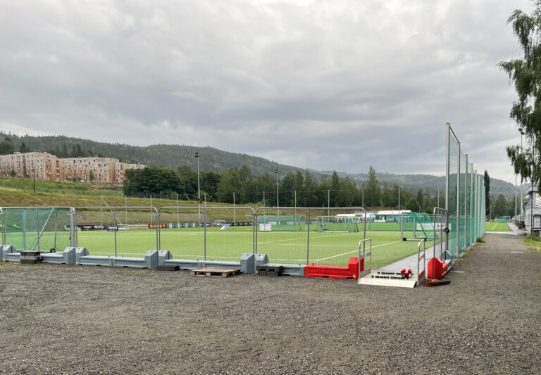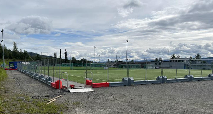For Lillehammer Kommune har vi levert sikring rundt kunstgressbane, med ca. 100 m ECOpanel byggegjerder i kombinasjon med vektblokker i spesialfarge. I tillegg besto leveransen av granulatfangere for å unngå at granulat kommer utenfor området.