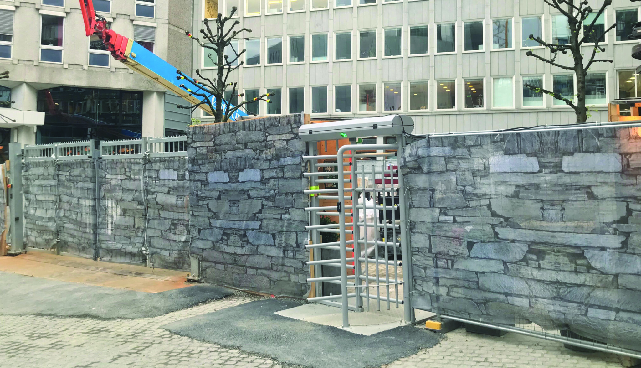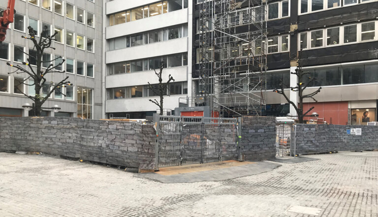 I et prosjekt i Oslo sentrum ønsket kunde å skjerme for innsyn og samtidig gjøre området hyggeligere for forbipasserende. Her er det benyttet vår standardduk med murmotiv. Duken er montert både på foldeport og byggegjerder.