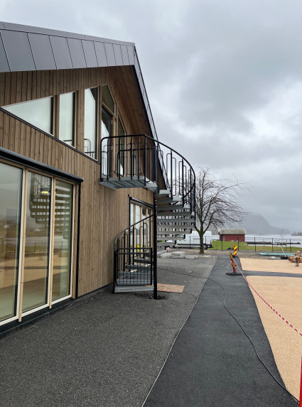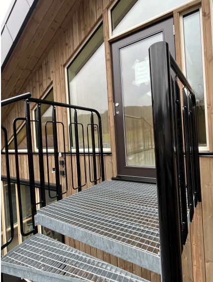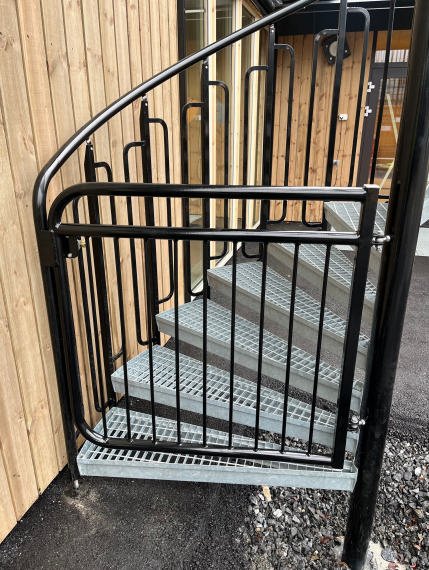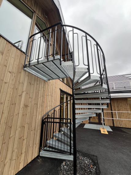 Vi er glad for å ha bidratt til en trygg og praktisk sikring med 2 spiraltrapper ved barnehage i Rogaland. Trappene har en høyde på 2,7 meter og en radius på 1,2 meter. Trappene er utstyrt med et barnesikkert rekkverk med håndløper av rør, og i bunn av trappen er det dør som hindrer barn i å gå i trappen uten tilsyn. Utførelse i varmforsinket stål i.h.t EN ISO 1461. Rekkverk og dør lakkert i sort RAL 9005.