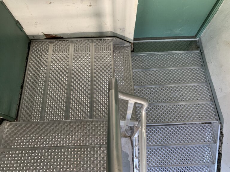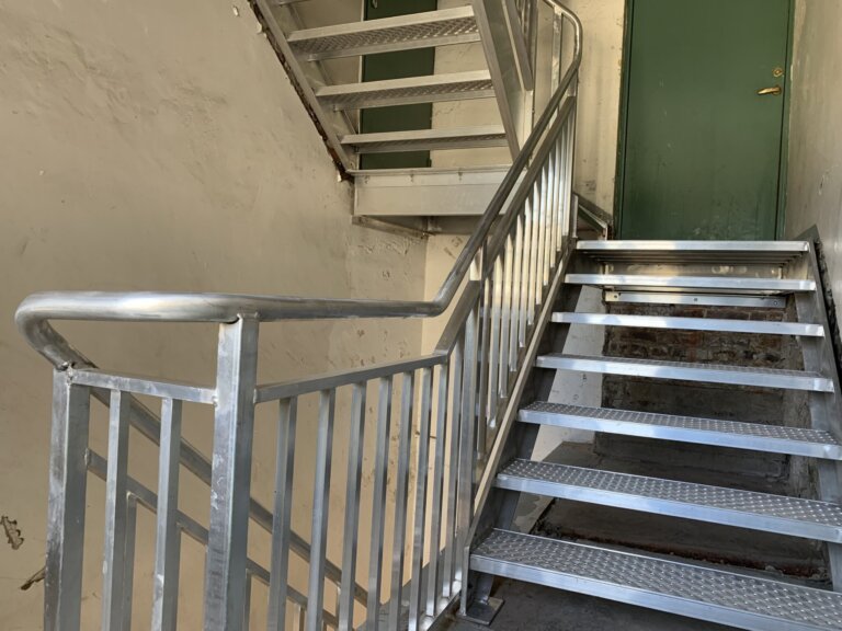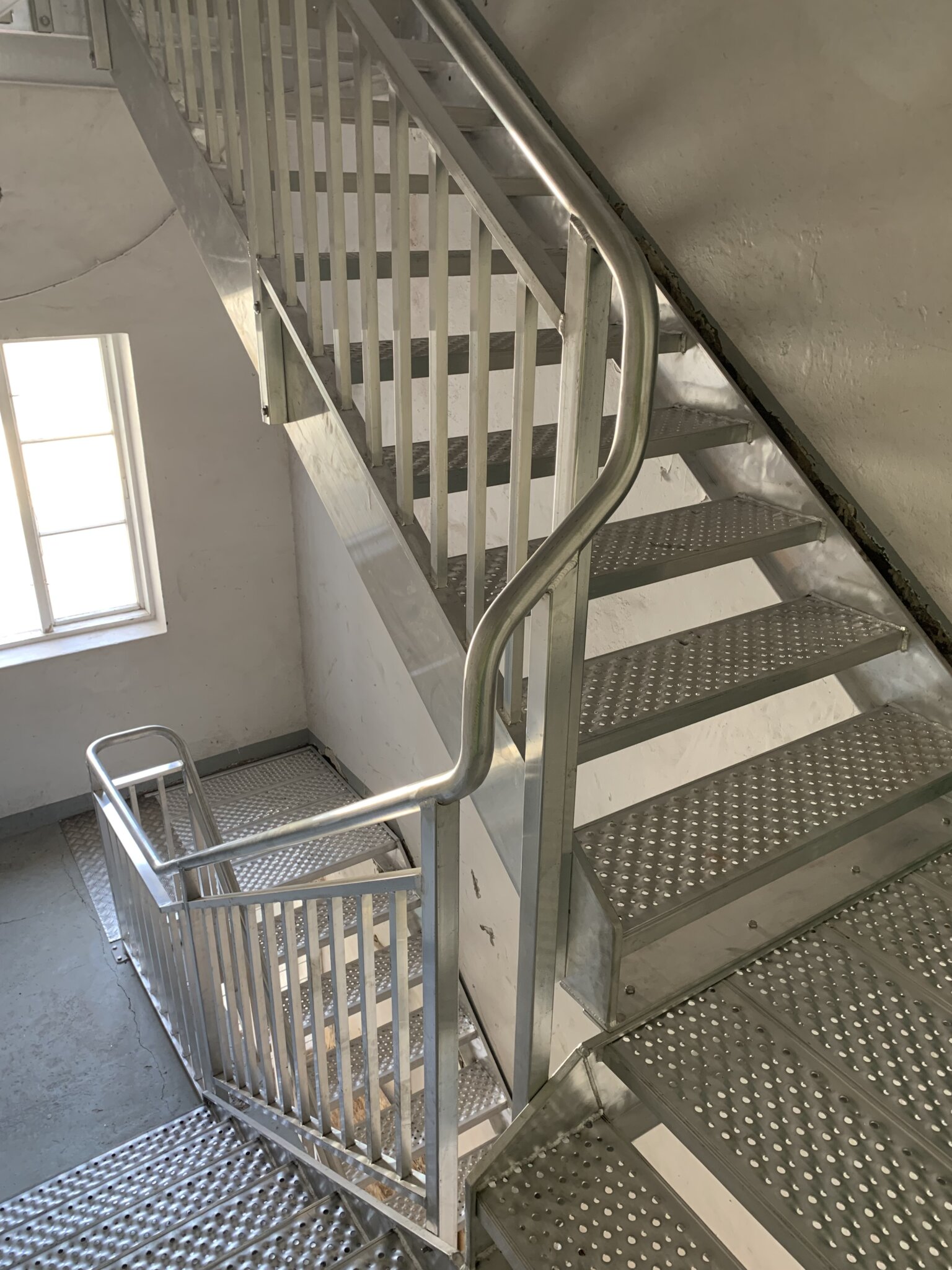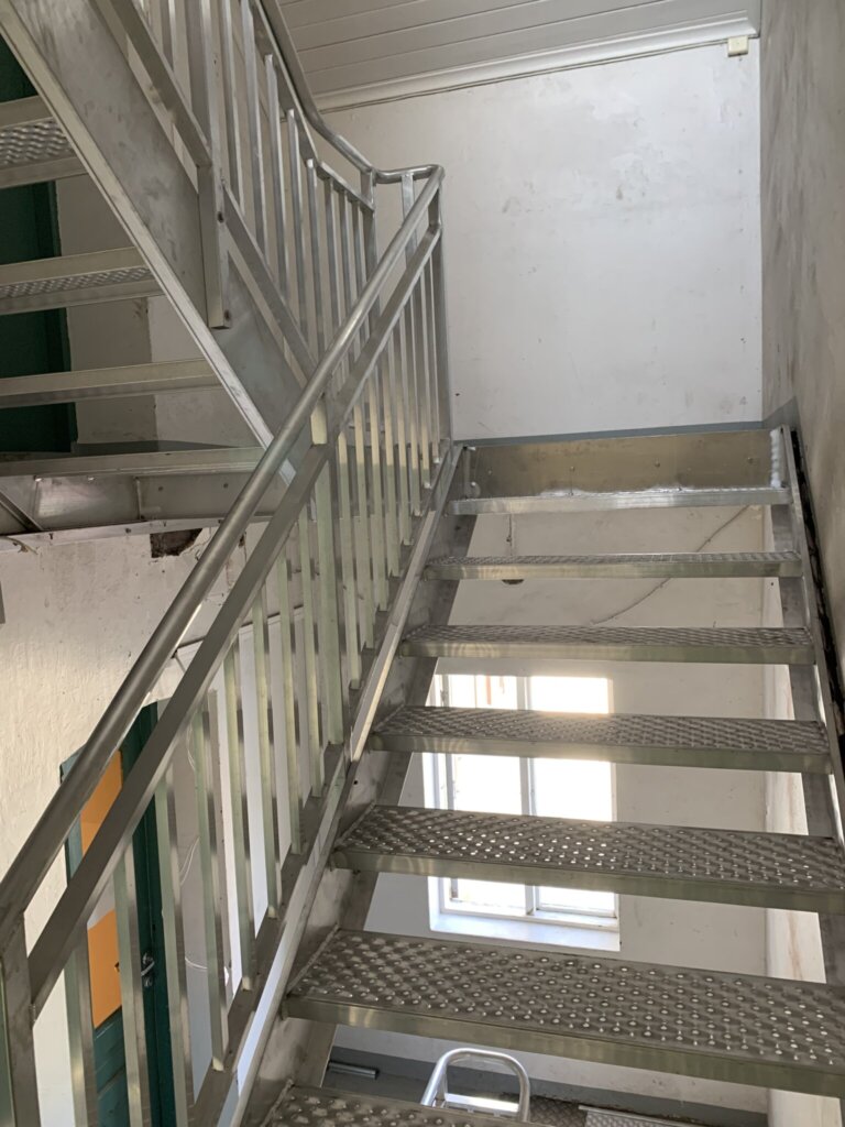 I forbindelse med rehabilitering av bygg som ble utført av Recover AS, sto Garda Sikring for produksjon og montering av alutrappene for rømningsvei. Dette var et omfattende prosjekt, med skreddersydd løsning produsert etter mål etter tett dialog med kunden gjennom hele prosessen. Eksisterende trapper var rustet i stykker bl.a. på grunn av lekkasjer, og kunde ønsket da å benytte vedlikeholdsfrie trapper av aluminium i stedet. Leveransen besto av 5 trappeløp med repos og spilerekkverk, der rekkverk og trapper ble boltet sammen.