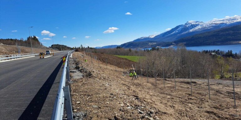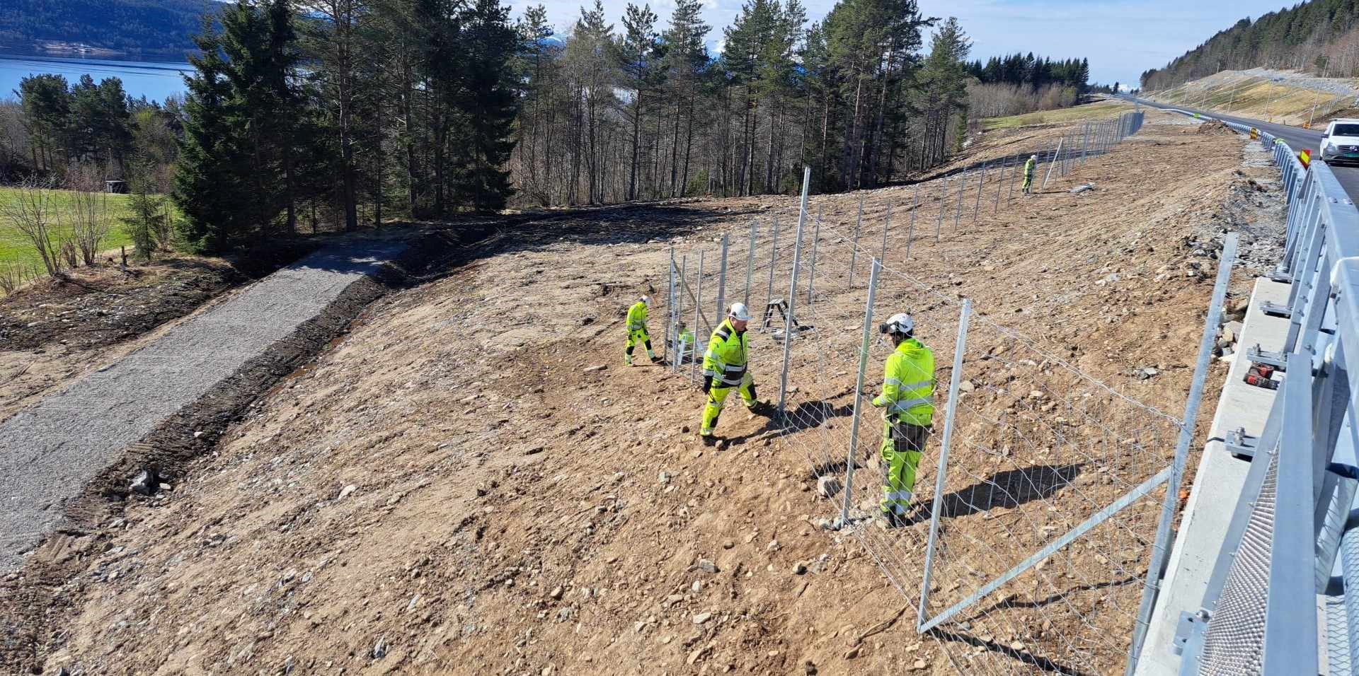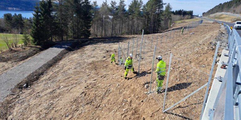 Viltgjerder langs veier bidrar til å redusere risikoen for påkjørsler av dyr, og beskytter både trafikanter og dyreliv. Her er noen av våre montører godt i gang med montering av flere hundre meter viltgjerde langs E39 i Molde.