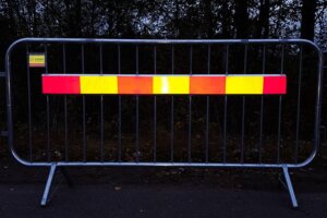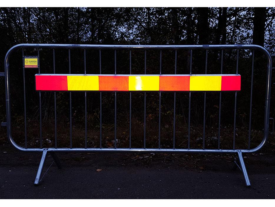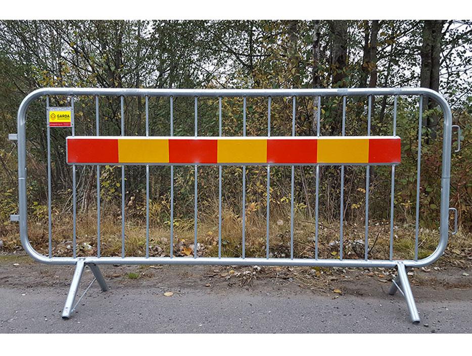 Sperregjerde med påsatt refleksplate for økt synlighet i trafikkerte områder. Benytt gjerne ballastblokk for ekstra tyngde og unngå at gjerdene velter i sterk vind etc.