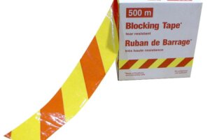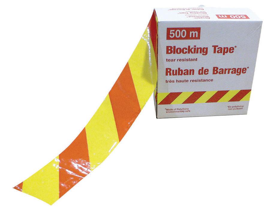 Rivesikkert sperrebånd på rull med rød og gul farge, 500 meter. Båndet knytes eller tapes fast i ønsket avsperringsområde.